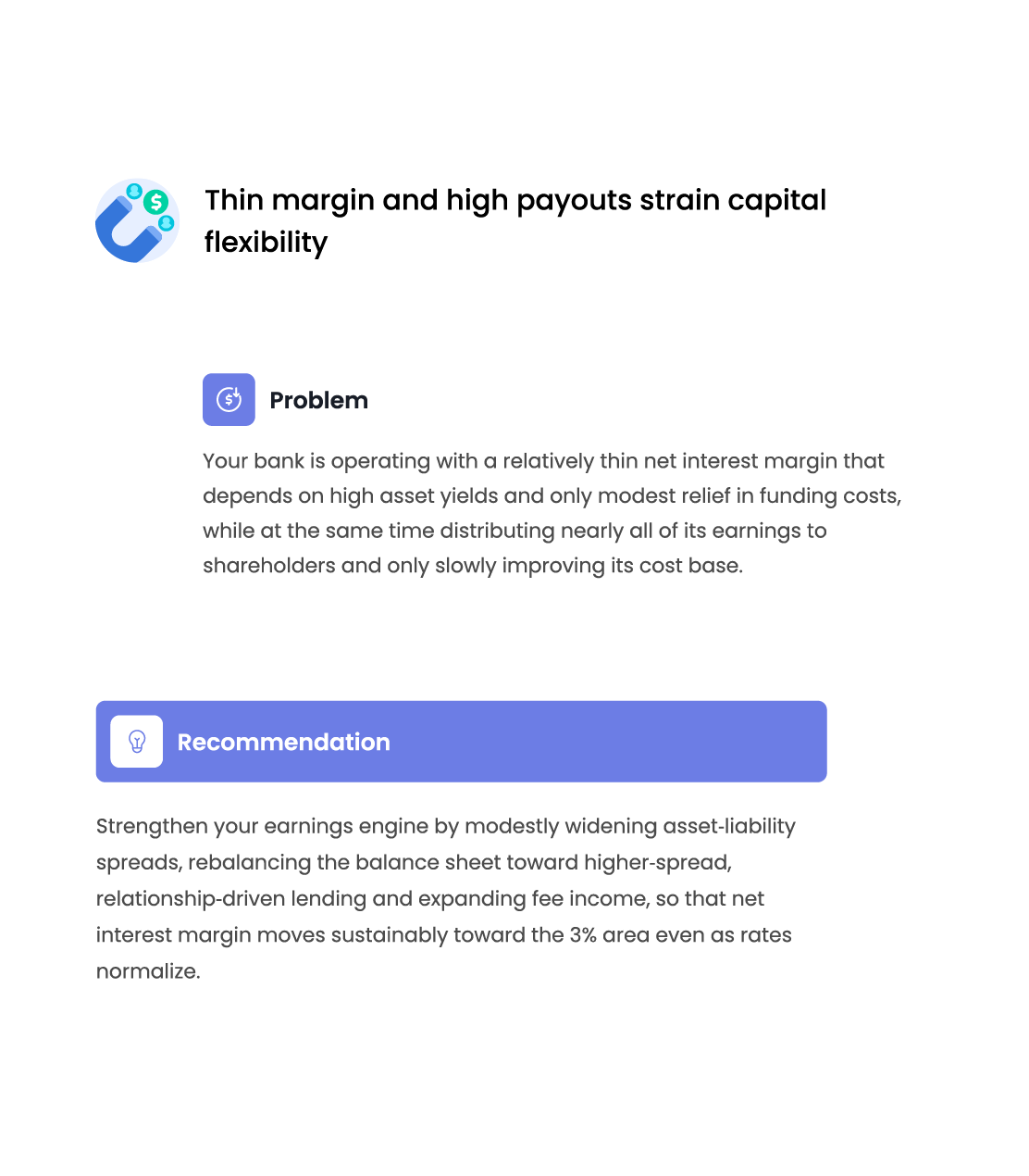 Autopilot Analyst converts over a decade of publicly available financial performance data for every U.S. bank and credit union along with 15 different key current economic indicators into 4-quarter forecasts, performance benchmarks, early warning signals, and strategies and tactics, giving leadership the clarity to act with confidence.