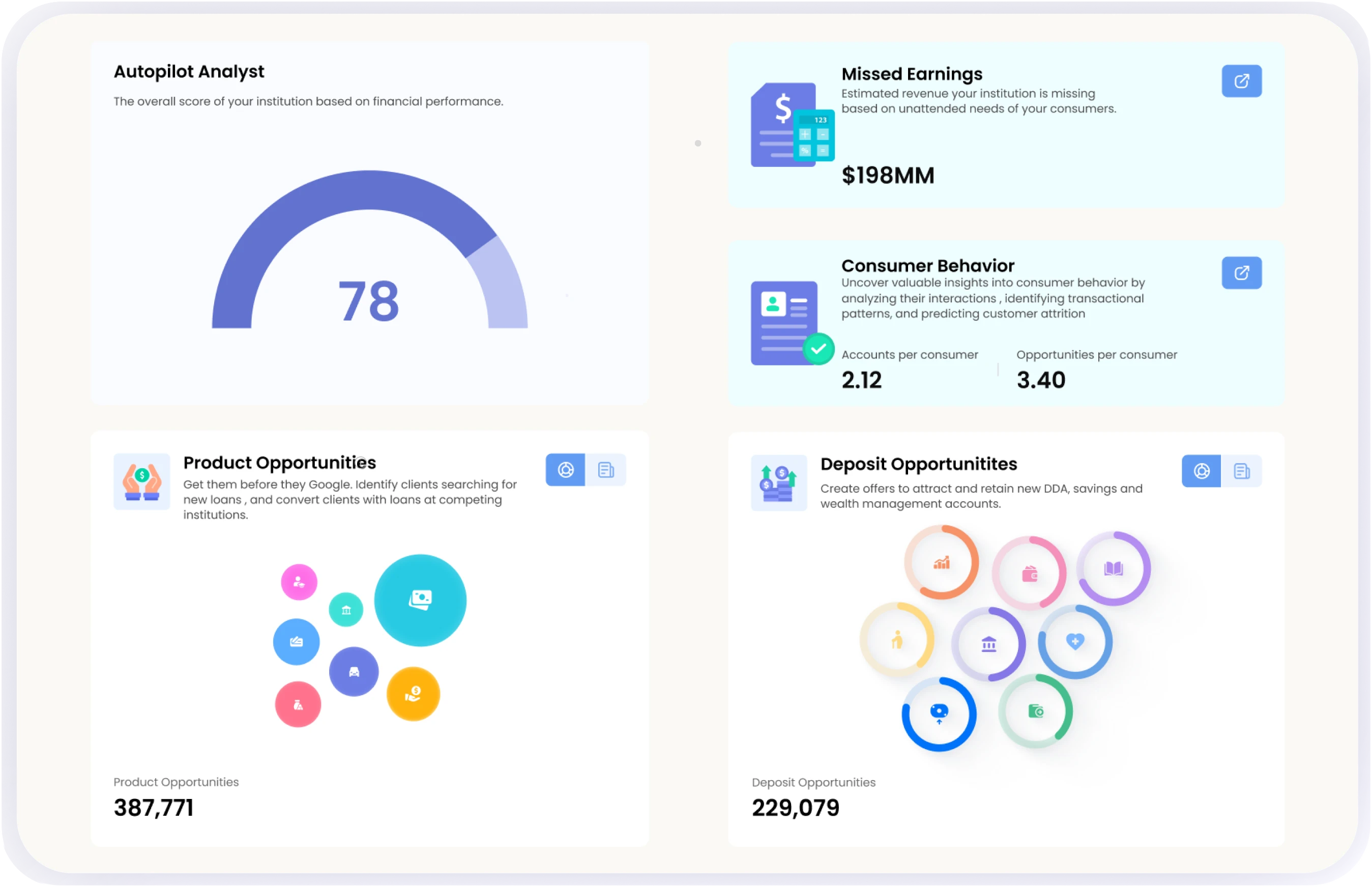 Your customer data already holds the answers. Autopilot turns those answers into action revealing when your customers are ready for the right product at the right time. No guesswork. No wasted offers. Just clear signals that unlock deposits, deepen relationships, and grow your financial institution with precision.